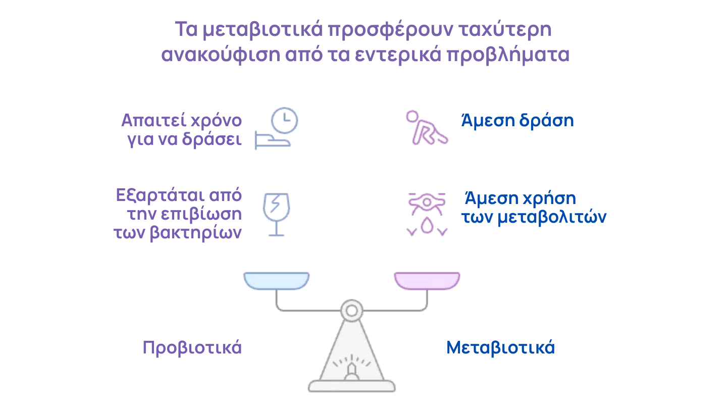 Όπως γίνεται σαφές, τα μεταβιοτικά παρακάμπτουν τα αβέβαια στάδια και παρέχουν απευθείας αυτό που χρειάζονται τα έντερά μας για ηρεμία και ισορροπία.