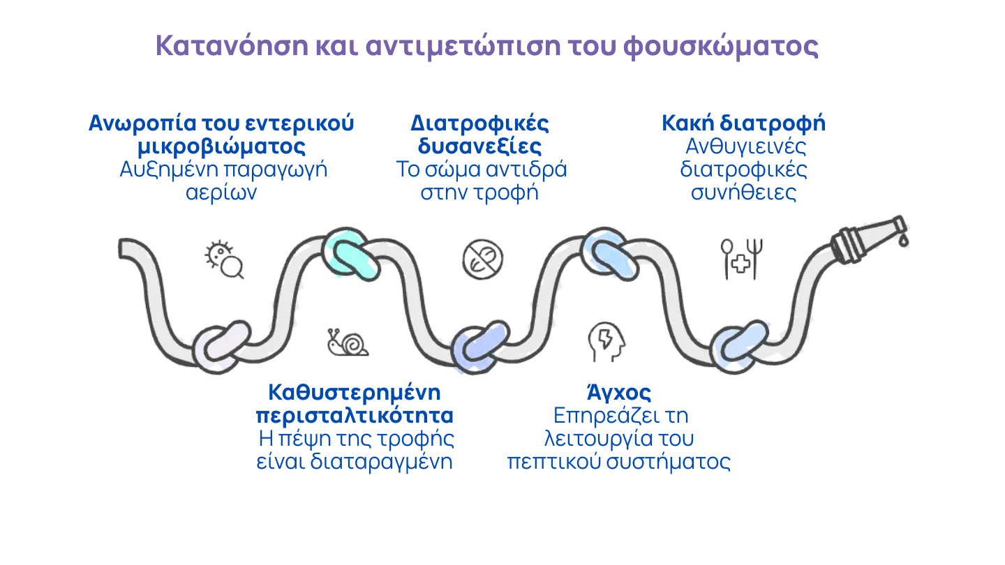 Όταν διαταραχθεί η ισορροπία μεταξύ των «καλών» και των «κακών» βακτηρίων στο έντερο, οι διαδικασίες ζύμωσης της τροφής μεταβάλλονται. Αυτό οδηγεί σε αυξημένη παραγωγή αερίων, όπως μεθάνιο και υδρογόνο, τα οποία διατείνουν το έντερο και προκαλούν πόνο και δυσφορία. Άλλοι παράγοντες περιλαμβάνουν την επιβράδυνση της περισταλτικότητας, τροφικές δυσανεξίες (στη λακτόζη, τη γλουτένη), το στρες και ανθυγιεινές διατροφικές συνήθειες. Η αποτελεσματική μείωση του φουσκώματος εξ