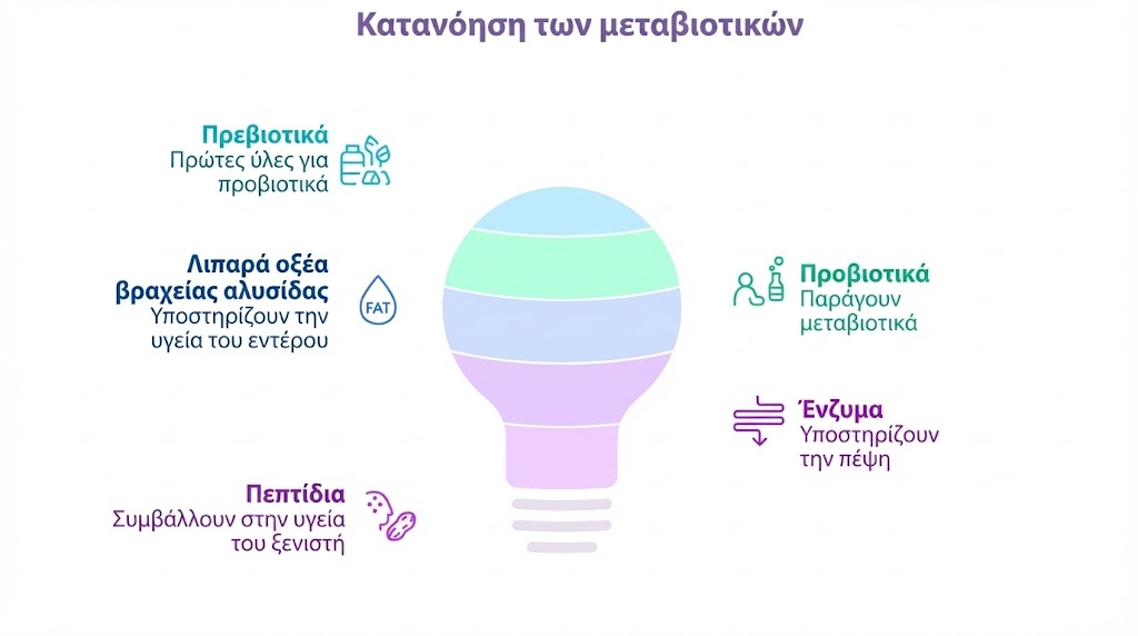 | Μεταβιοτικά | Μη ζωντανοί μικροοργανισμοί και/ή τα μεταβολικά τους προϊόντα. | Να προσφέρουν άμεσα οφέλη για την υγεία, όπως ενίσχυση του εντερικού φραγμού και ρύθμιση του ανοσοποιητικού συστήματος. |