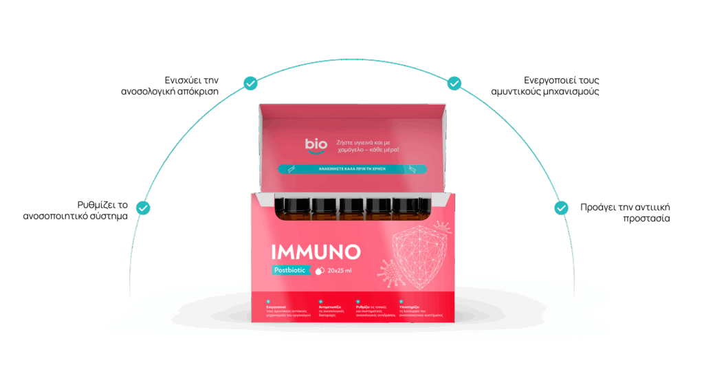 Τα μεταβιοτικά υποστηρίζουν το ανοσοποιητικό σύστημα, διεγείροντας τη δραστηριότητα βασικών ανοσοκυττάρων και ρυθμίζοντας τις φλεγμονές. Για παράδειγμα, το οξικό και το γαλακτικό ενεργοποιούν τα Τ-κύτταρα, τα οποία προστατεύουν από αυτοάνοσες αντιδράσεις. Άλλες ενώσεις καταστέλλουν τις υπερβολικές φλεγμονώδεις αποκρίσεις και συμβάλλουν έτσι στη δημιουργία ισορροπίας. Αυτό οδηγεί σε καλύτερη προστασία από ιούς, βακτήρια και αλλεργίες.