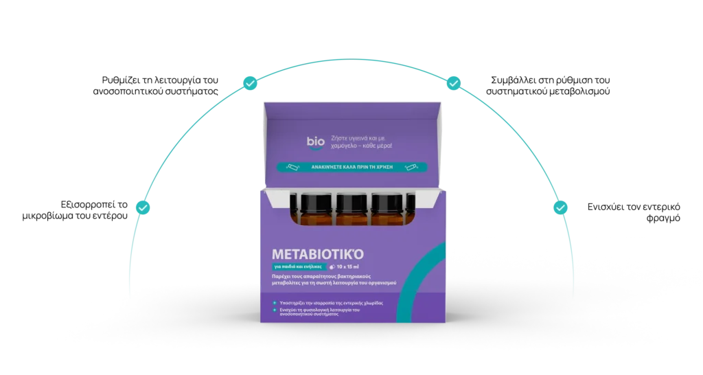 Τα μεταβιοτικά υποστηρίζουν ένα υγιές εντερικό περιβάλλον, τρέφουν τα ωφέλιμα βακτήρια και προστατεύουν από την εντερική δυσβίωση – μια κατάσταση κατά την οποία διαταράσσεται η ισορροπία μεταξύ «καλών» και «κακών» βακτηρίων. Βοηθούν σε φούσκωμα, διάρροια, πόνους και σπασμούς, αποκαθιστούν τον εντερικό φραγμό και διατηρούν την οξύτητα, ώστε να μην αναπτύσσονται επιβλαβή μικρόβια.