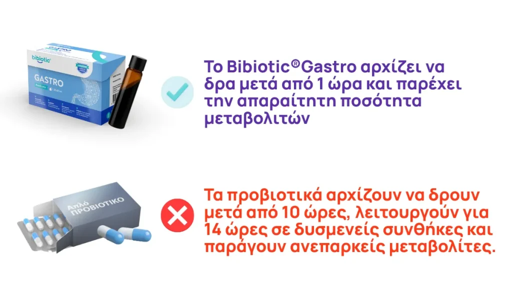 Ενώ τα προβιοτικά πρέπει να εγκατασταθούν στο έντερο και να βρουν εκεί κατάλληλες συνθήκες για να αναπτυχθούν, ώστε να παράγουν τους απαραίτητους για τον οργανισμό μεταβολίτες — κάτι που απαιτεί χρόνο και ειδικές προϋποθέσεις που δεν υπάρχουν πάντα — τα μεταβιοτικά παρέχουν όλους αυτούς τους μεταβολίτες άμεσα και έτοιμους.