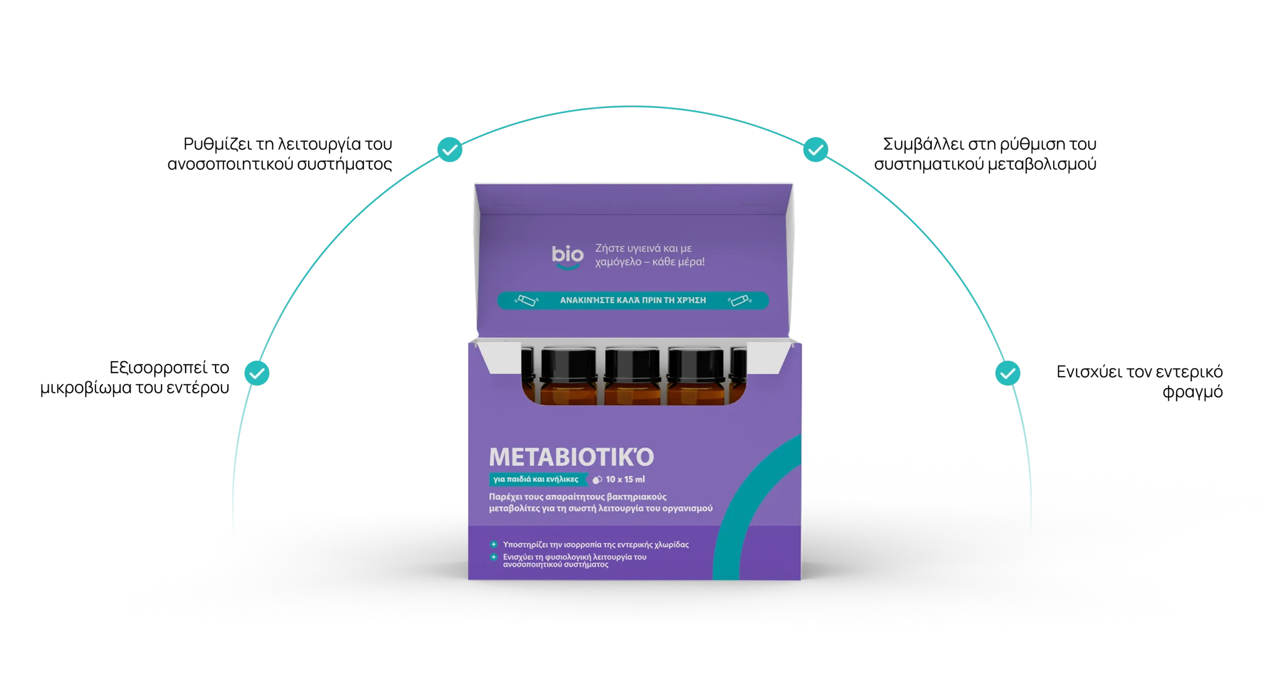 Τα μεταβιοτικά ανήκουν σε μια νέα κατηγορία προβιοτικών προϊόντων – ακόμη πιο ωφέλιμα και σημαντικά πιο αποτελεσματικά από τα πρεβιοτικά, τα προβιοτικά και τα συμβιοτικά. Τα μεταβιοτικά προσφέρουν όλα τα οφέλη των προβιοτικών, χωρίς τα μειονεκτήματά τους. Αντιθέτως, δρουν πιο γρήγορα, πιο άμεσα και πιο αποτελεσματικά για την ενίσχυση της υγείας μας.
