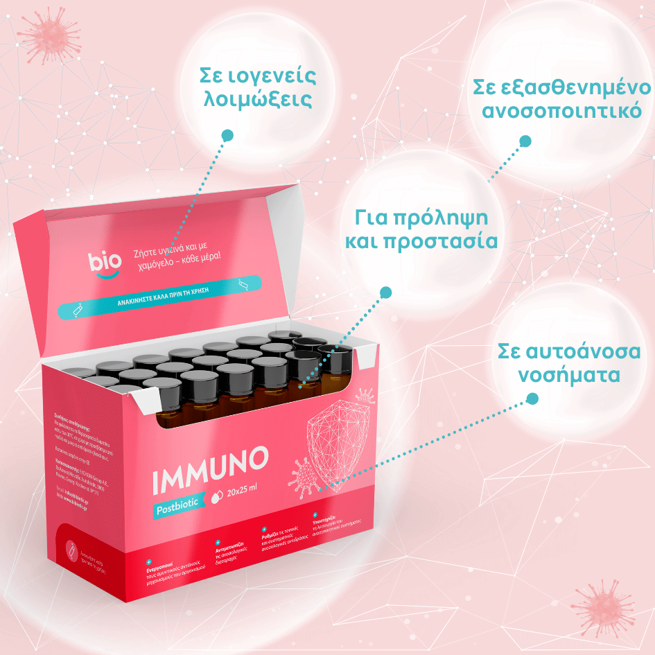 Το Bibiotic® Immuno είναι ένας καινοτόμος ανοσορυθμιστής που υποστηρίζει τις φυσικές αμυντικές λειτουργίες του οργανισμού. Η φόρμουλά του βοηθά στην ταχύτερη ανάρρωση, ενεργοποιεί την τοπική και συστημική ανοσολογική απόκριση και είναι κατάλληλη για ιογενείς λοιμώξεις, πτώση ανοσίας και πρόληψη.