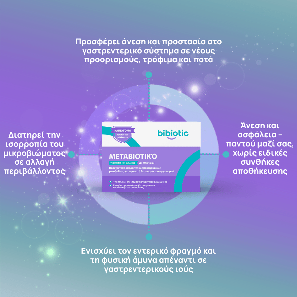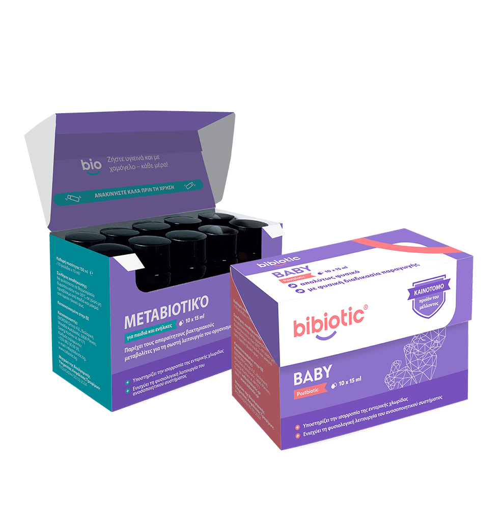 Το Bibiotic® για παιδιά και ενήλικες είναι μια καθολική μεταβιοτική φόρμουλα, σχεδιασμένη να υποστηρίζει την υγεία του εντέρου και την ανοσία σε παιδιά άνω των 3 ετών και ενήλικες. Είναι κατάλληλο για απαιτητική καθημερινότητα, ταξίδια, στρες ή αλλαγές στη διατροφή — παράγοντες που συχνά οδηγούν σε δυσφορία, φούσκωμα και διαταραγμένη ισορροπία του μικροβιώματος. Το προϊόν βοηθά στην καλύτερη πέψη, μειώνει το αίσθημα βάρους και υποστηρίζει έναν πιο δυνατό και ανθεκτικό οργανισμό όλο τον χρόνο.