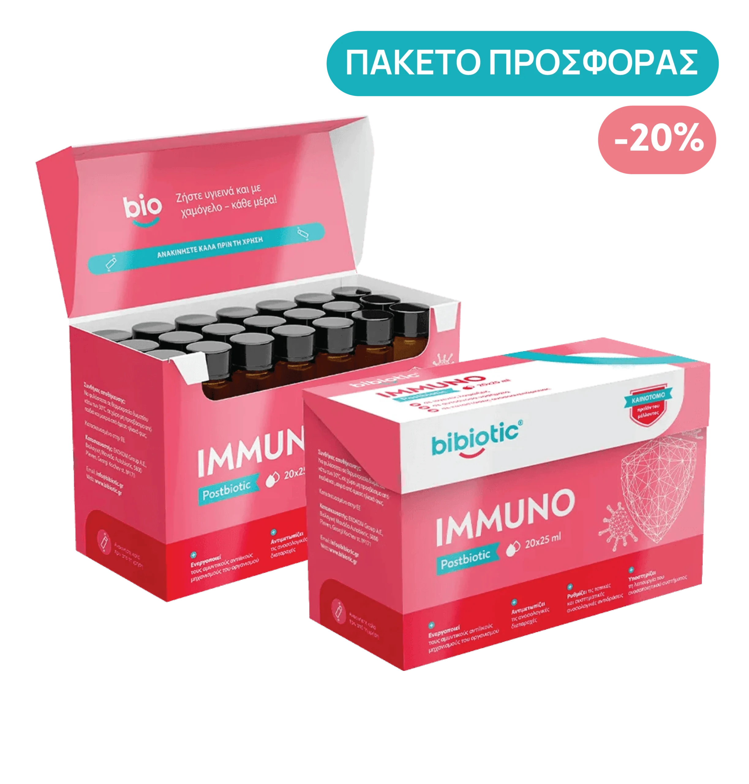 Το προωθητικό πακέτο με 2 συσκευασίες Bibiotic® Immuno είναι μια πρακτική λύση για όσους θέλουν να διατηρήσουν ισχυρή ανοσία κατά τις ιογενείς περιόδους. Ο καινοτόμος ανοσορυθμιστής υποστηρίζει τη φυσική άμυνα του οργανισμού και επιταχύνει την ανάρρωση σε ιογενείς και γριπώδεις καταστάσεις.