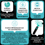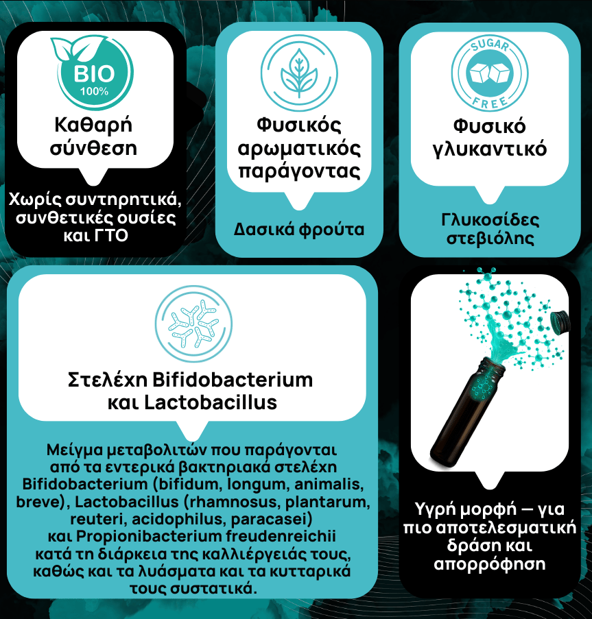 Σύνθεση: Μείγμα μεταβολιτών από εντερικά βακτηριακά στελέχη B. bifidum, B. longum, B. animalis, B. breve, L. rhamnosus, L. plantarum, L. reuteri, L. acidophilus, L. paracasei και P. freudenreichii κατά την καλλιέργεια, καθώς και τα λύματα και τα κυτταρικά τους συστατικά.