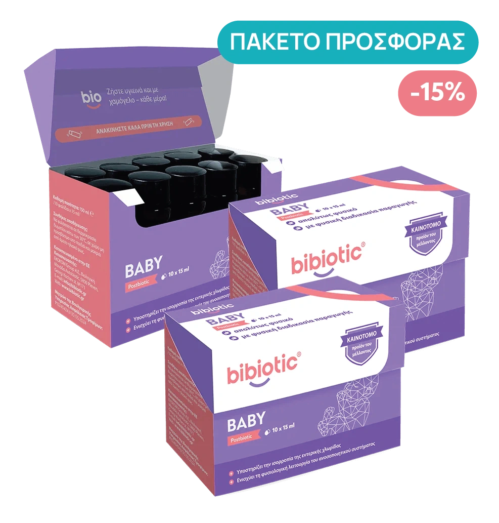Bibiotic® Baby είναι ένα μεταβιοτικό συμπλήρωμα διατροφής, σχεδιασμένο να υποστηρίζει τη φυσική ισορροπία της εντερικής μικροχλωρίδας και να προσφέρει άνεση στο μωρό από τις πρώτες κιόλας εβδομάδες.Η φόρμουλα βοηθά στην ανακούφιση των κολικών, στη μείωση των αερίων και του φουσκώματος, ενώ παράλληλα υποστηρίζει την ανάπτυξη ενός υγιούς ανοσοποιητικού συστήματος. Το προωθητικό πακέτο προσφέρει μια μακροπρόθεσμη λύση για τη διατήρηση σταθερής εντερικής ισορροπίας και καλής πέψης σε βρέφη και μικρά παιδιά έως 3 ετών.