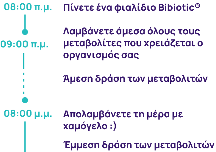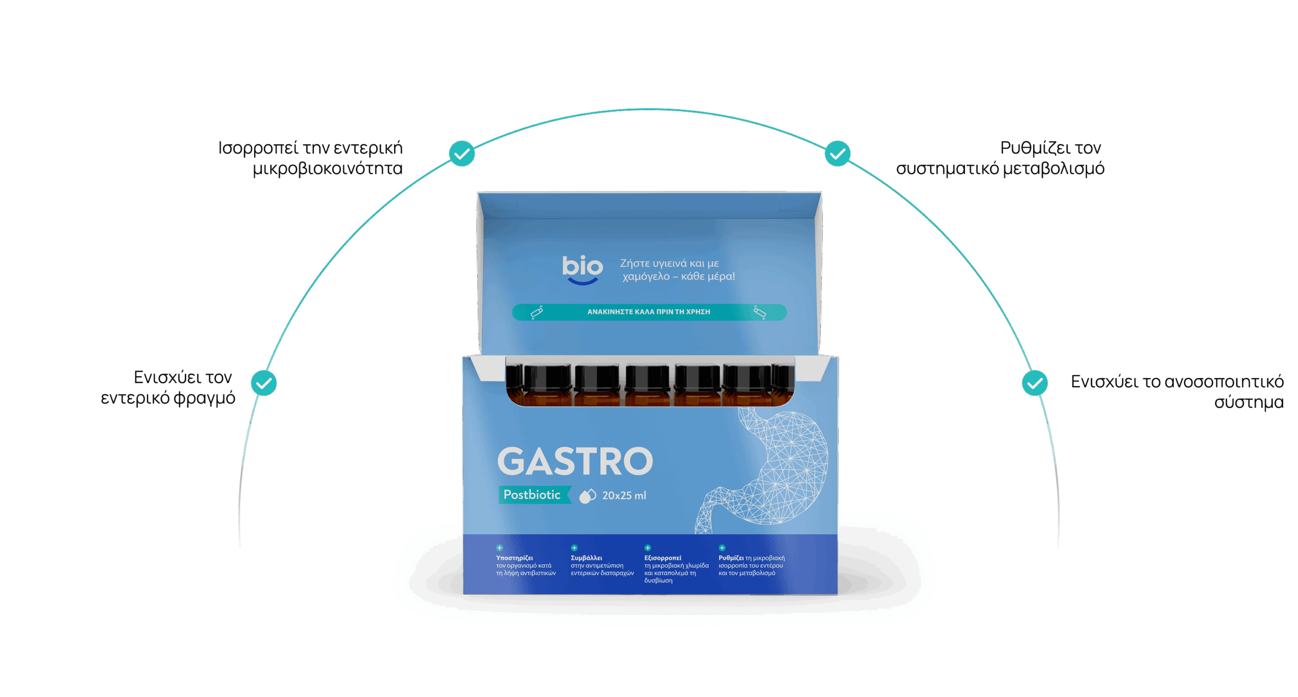 Το μεταβιοτικό BIBIOTIC® GASTRO αποτελεί έναν ισχυρό ρυθμιστή της μικροβιακής χλωρίδας και έχει αποδεδειγμένη αποτελεσματικότητα στην αντιμετώπιση της δυσβίωσης. Η εντερική δυσβίωση είναι ένα από τα σημαντικότερα προβλήματα υγείας στη σύγχρονη εποχή. Το πεπτικό μας σύστημα φιλοξενεί τρισεκατομμύρια μικροοργανισμών διαφόρων ειδών, καθένα από τα οποία εκτελεί συγκεκριμένες λειτουργίες και αποτελεί μέρος ενός πολύπλοκου μεταβολικού δικτύου. Ακόμη και οι παθογόνοι μικροοργανισμοί έχουν τον ρόλο τους, όπως η εκπαίδευση και η διατήρηση της ενεργής λειτουργίας του ανοσοποιητικού συστήματος. Επομένως δεν υπάρχουν «καλά» ή «κακά» βακτήρια - καθοριστικός παράγοντας είναι η ισορροπία μεταξύ τους. Η φυσιολογική και υγιής κατάσταση της μικροβιακής κοινότητας ονομάζεται νορμοβίωση ή ευβίωση. Όταν αυτή η ισορροπία διαταραχθεί και κάποιοι μικροοργανισμοί υπερτερούν έναντι άλλων, δημιουργείται μικροβιακή ανισορροπία, γνωστή ως δυσβίωση. Αυτό επιφέρει αλλαγές στην ποσότητα και στην ποιότητα των βακτηριακών μεταβολιτών, προκαλώντας διάφορα προβλήματα υγείας, όπως φούσκωμα, αέρια, κράμπες, διάρροια, δυσκοιλιότητα, κοιλιακούς πόνους, κόπωση, αλλεργικές αντιδράσεις, διαταραχές του ανοσοποιητικού συστήματος και άλλα. Οι αιτίες της δυσβίωσης είναι ποικίλες και περιλαμβάνουν την έκθεση σε τοξίνες από το περιβάλλον, καταστάσεις στρες, κακή διατροφή, χρήση αντιβιοτικών και άλλων φαρμάκων, ανοσοανεπάρκεια, παρασιτικές λοιμώξεις, κατανάλωση τροφίμων με φυτοφάρμακα, συντηρητικά και άλλα αντιβακτηριακά συστατικά. Για να αποκαταστήσουμε την ισορροπία της εντερικής μικροβιακής κοινότητας, πρέπει να αποκαταστήσουμε και την ισορροπία των βακτηριακών μεταβολιτών. Αυτοί με τη σειρά τους αναστέλλουν την ανάπτυξη των ανεπιθύμητων μικροοργανισμών και ενισχύουν την ανάπτυξη των μειωμένων ωφέλιμων ειδών. Η λήψη του μεταβιοτικού BIBIOTIC® GASTRO παρέχει τους απαραίτητους βακτηριακούς μεταβολίτες που υποστηρίζουν την αποκατάσταση της φυσιολογικής μικροβιακής ισορροπίας και την αντιμετώπιση της δυσβιωτικής κατάστασης.