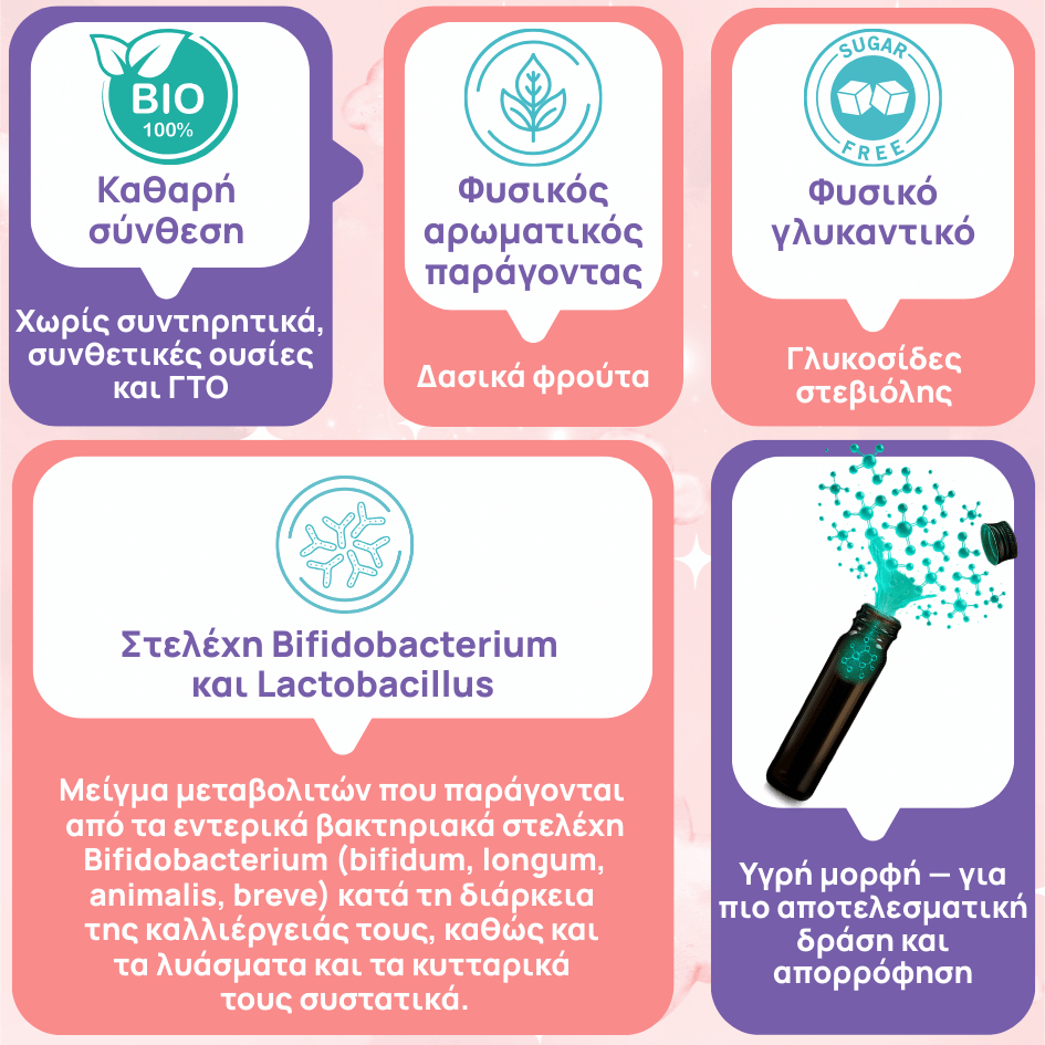 Δεν περιέχει συντηρητικά ή συνθετικές ουσίες. Έχει παραχθεί χωρίς τη χρήση γενετικά τροποποιημένων οργανισμών (ΓΤΟ) και πληροί όλα τα κριτήρια ενός αποτελεσματικού μεταβιοτικού προϊόντος.