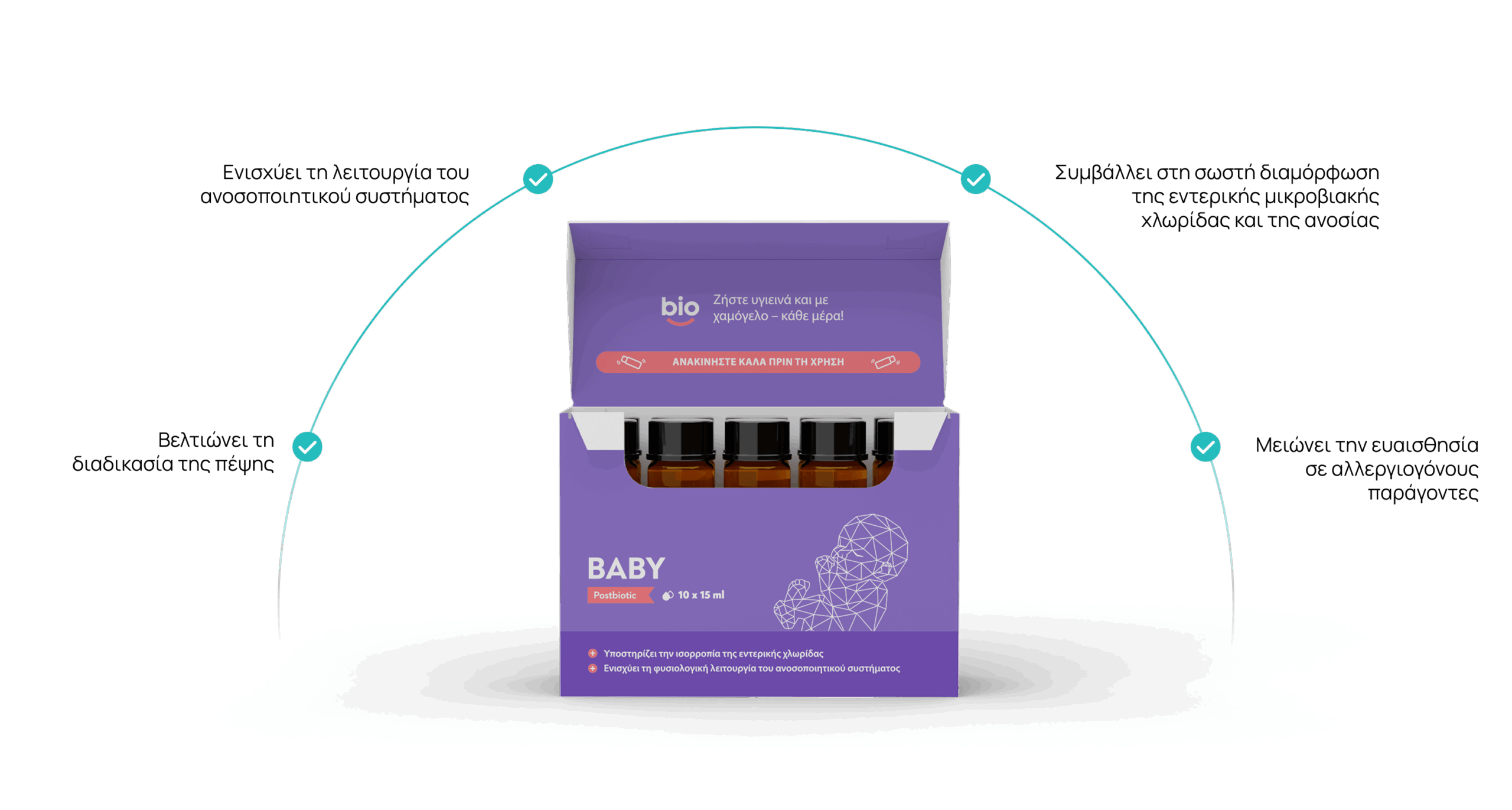 Κατά τη βρεφική ηλικία, το εντερικό μικροβίωμα βρίσκεται ακόμη σε φάση ανάπτυξης. Η ισορροπία του είναι καθοριστική για το πόσο ανθεκτικό θα είναι το παιδί απέναντι σε λοιμώξεις και αλλεργίες. Τα μεταβιοτικά μεταβολίτες στο Bibiotic® για βρέφη υποστηρίζουν την ανάπτυξη της ωφέλιμης μικροχλωρίδας και ενισχύουν τον φυσικό «προστατευτικό φραγμό» του εντέρου. Έτσι δημιουργείται μια σταθερή βάση για ένα υγιές ανοσοποιητικό σύστημα στο μέλλον.