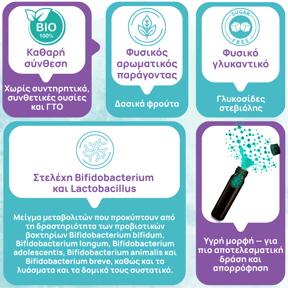 Μείγμα μεταβολιτών που παράγονται από τη δραστηριότητα των προβιοτικών βακτηρίων: Bifidobacterium bifidum, Bifidobacterium longum, Bifidobacterium adolescentis, Bifidobacterium animalis και Bifidobacterium breve, καθώς και των παραγώγων βακτηριακής λύσης και των δομικών τους στοιχείων.